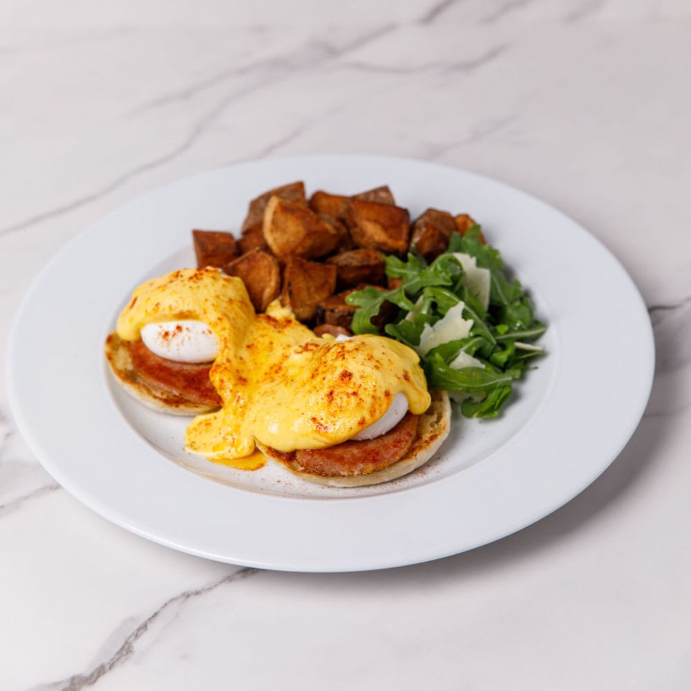 two poached eggs, peameal bacon, hollandaise, english muffin, roasted potatoes